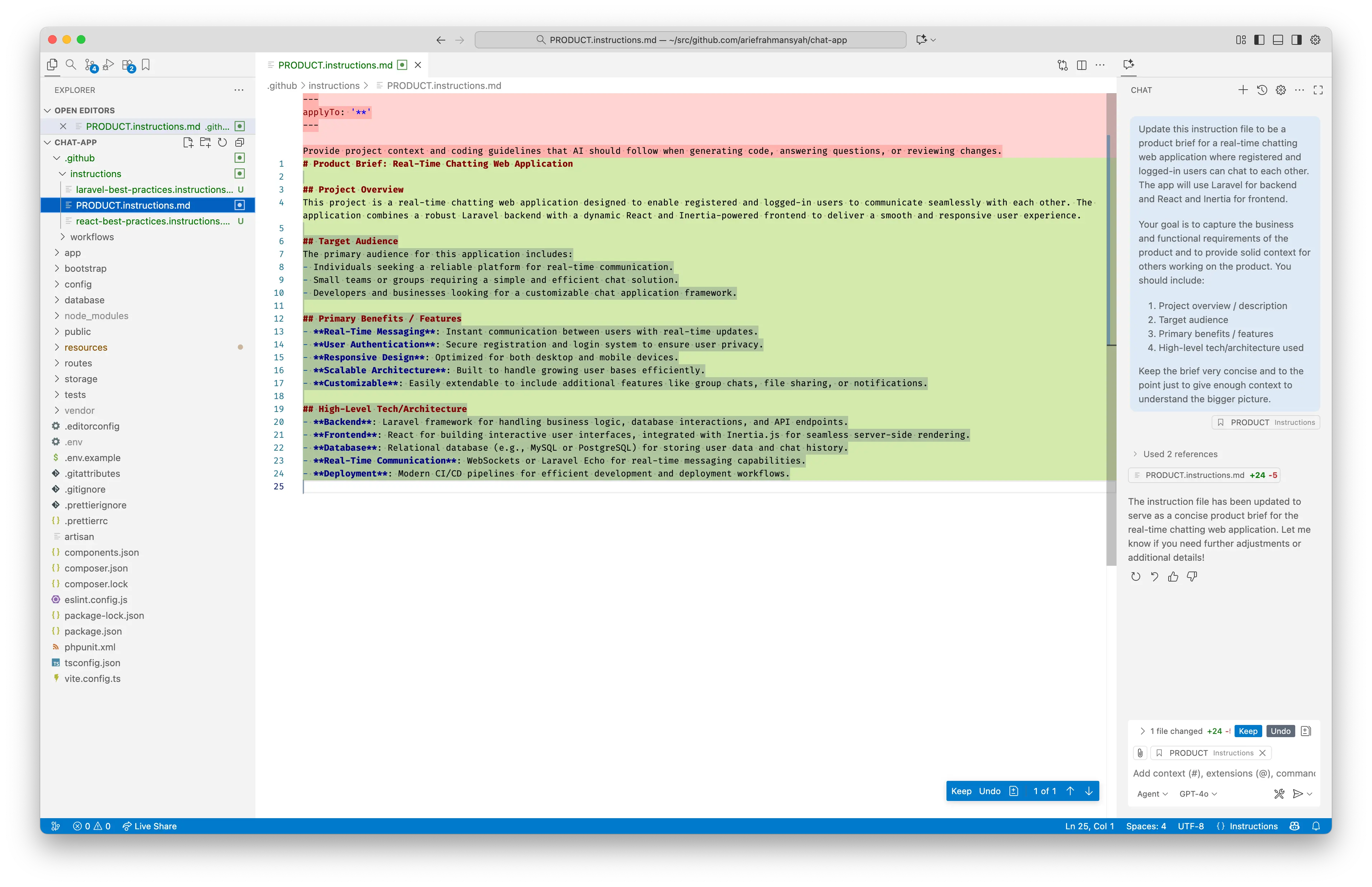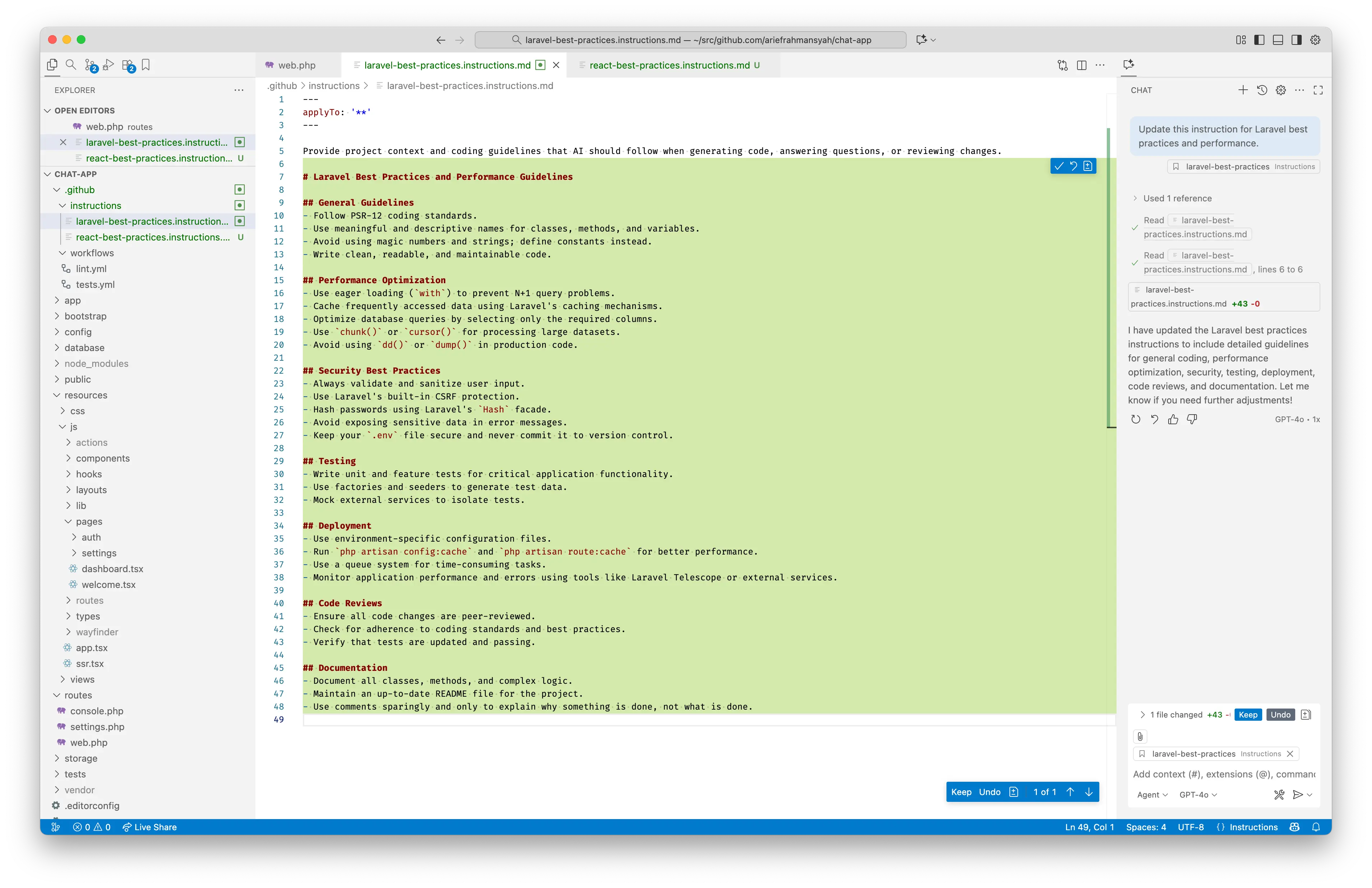 File laravel-best-practices.instructions.md di folder .github/instructions akan diupdate oleh AI agent. Kita bisa mereviewnya atau langsung klik tombol Keep untuk menyimpan.